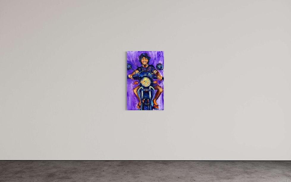 An expressive portrait of a Balinese man on a motorcycle, created in a vivid and dynamic manner. The contrast of saturated colors and energetic brushstrokes conveys a sense of movement and freedom.