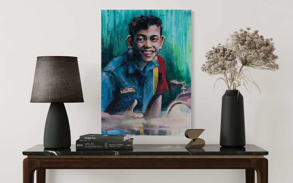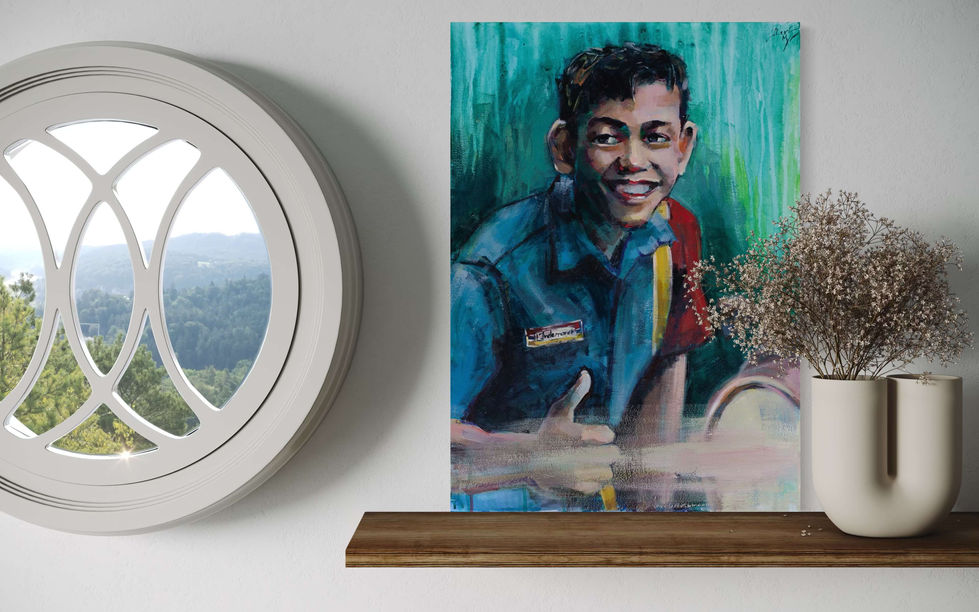 The idea behind this painting is to convey the essence of Bali through my own emotional perception. I depicted a Balinese man as a symbol of joy and optimism in everyday life. His smile and the “thumbs‑up” gesture, illuminated by the motorcycle’s headlight, reflect confidence, inner strength, and a positive outlook on the future despite daily challenges. With this gesture, he seems to share his happiness with those around him.