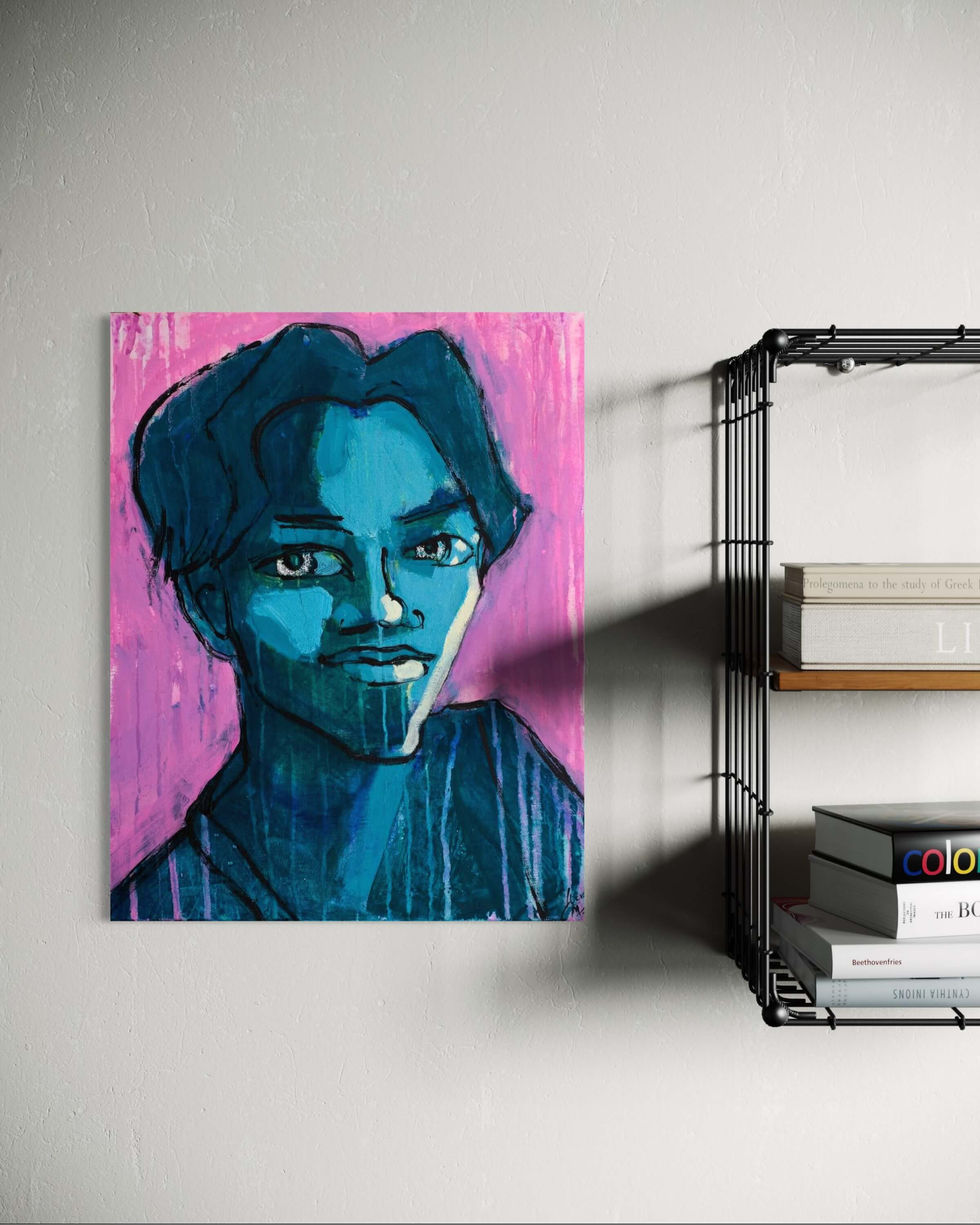An expressive portrait in a graphic style, built on the contrast of saturated colors and concise forms. The interplay between cool blue tones and the intense pink background creates a tense visual dialogue, emphasizing the emotional depth of the image. Clear contours and simplified shapes enhance the expressiveness of the gaze, turning the portrait into an exploration of a person’s inner state.